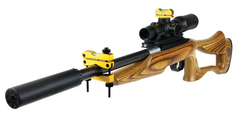 The Accutech reticle level system is a precision tool designed to allow a scope to be perfectly leveled on any firearm with ease. The system is comprised of two aluminum level housings calibrated to their integrated levels. The barrel clamp level is attached to the guns barrel while the smaller reference level is placed on scope base, bottom half of a ring or other flat surface perpendicular to the vertical axis of the gun. The gun is then rotated until the reference level is aligned. The tuning adjustment knob on the Barrel clamp level is then turned until its level is centered to match the reference level. At this point the barrel clamp level is calibrated to the guns axis. The scope can be installed loosely and the reference level placed on top of the scopes turret cap. The scope is rotated until the reference level is aligned with the barrel clamp level and then simply secured in place.